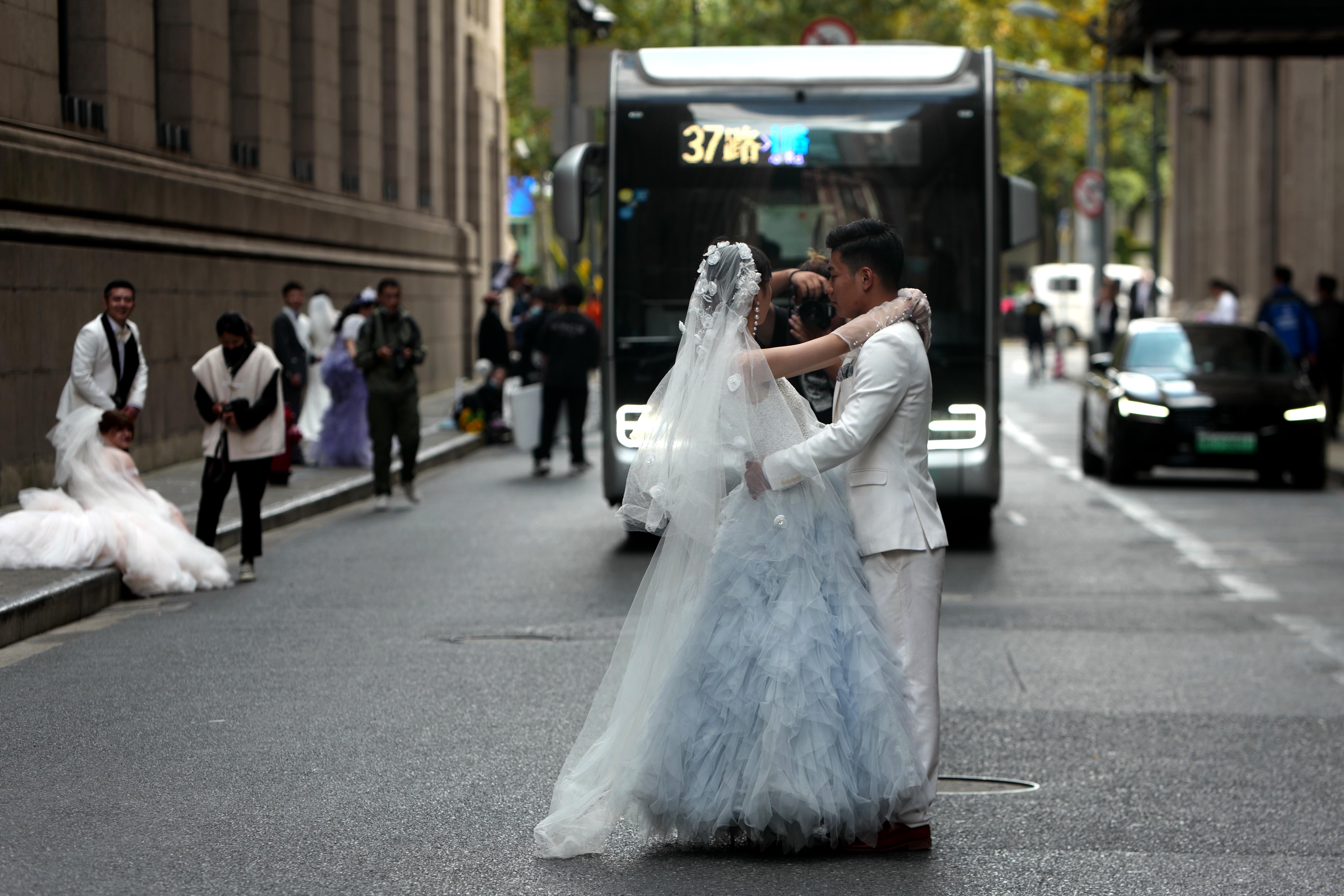 11月17日下午,靠近外滩的滇池路上有不少新人在拍摄婚纱照。只见一位摄影师为了追求拍摄角度指挥新人站到路中央,新人全神贯注盯着镜头,摄影师的注意力也都在新人身上,一辆过境的37路公交无奈地停下,等他们拍好后小心地避开驶过。