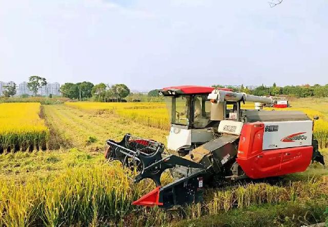伴随着机械的轰鸣声,水稻收割机在稻田间来回穿梭作业,金灿灿的稻谷犹如一道道金色的带子流进停靠在田边的货车中,丰收的喜悦感染着在场的每一个人。
