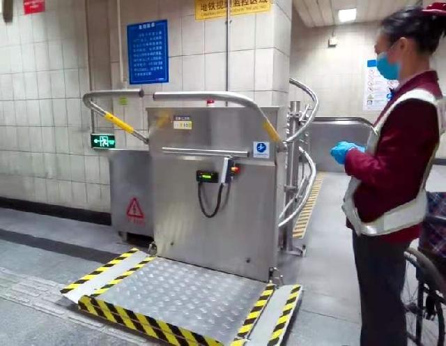 这台设备不用时可折叠收起,完全不影响其他乘客的通行。当需要使用时可以打开,其外观如同一台小型的升降机,有金属围栏保护。为确保特殊乘客的安全,工作人员将机器的运行速度设置在一个比较平稳的水平上。