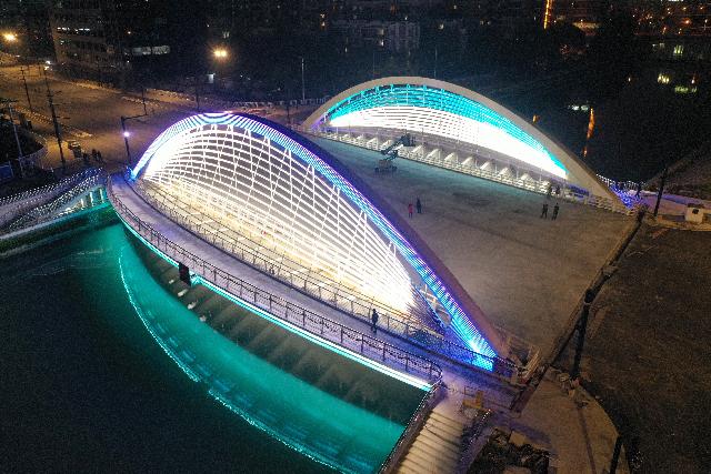 每当夜幕降临,桥面的景观灯带绚烂多彩,景观喷雾在璀璨灯光下云雾缭绕,桥梁倒映在水中微微荡漾,仿佛置身水中仙境,又好似乘着弯弯明月摇曳在苏州河上,为市民提供苏州河畔舒适、惬意的休闲漫步空间,提升市民的满意感和获得感。