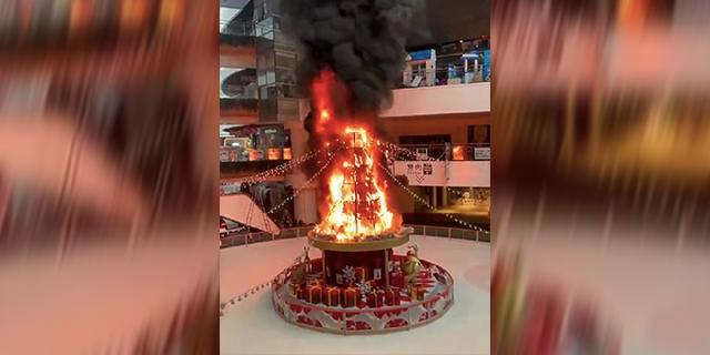 圣诞树分上下两层,明火是从圣诞树中部燃起的,冒出的浓烟直冲室外空间的5层吊顶。”