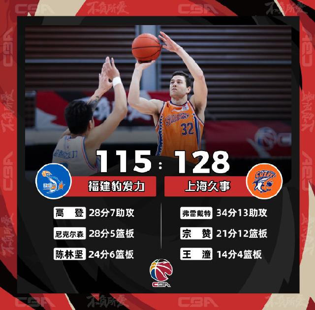 北京时间12月23日晚,2020-2021赛季CBA联赛常规赛继续进行,上海久事对阵福建豹发力。由于王哲林脑震荡伤缺,福建内线实力大损,此役两队打出对攻战,最终上海男篮凭借7人上双的团队表现,以128比115战胜对手,收获赛季第二个两连胜。