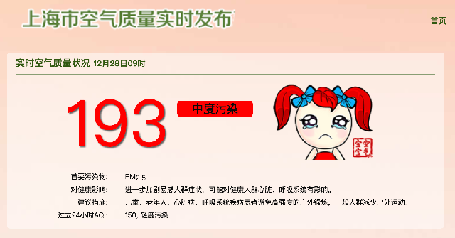当前实时空气质量指数为193,已经接近200的重度污染指标。不过,市环境监测中心预报,本次污染是受到上游污染输送叠加本地静稳累积影响,污染物扩散条件不利导致,今天下午起,空气质量将逐步好转,空气质量分段指数在60-80之间。明天,空气质量为优至良。