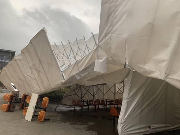 发现此情况后,后勤保障部、保卫处立即对现场进行警戒,然后组织人员把雨棚全部收拢,至下午5点处置完毕。后续将等天气好转后进一步处理。