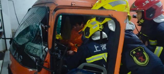 货车司机的双脚被死死卡在方向盘与驾驶座位之间无法动弹,一段时间的卡死让被困司机已经出现了双脚麻木的感觉,情况十分危急。