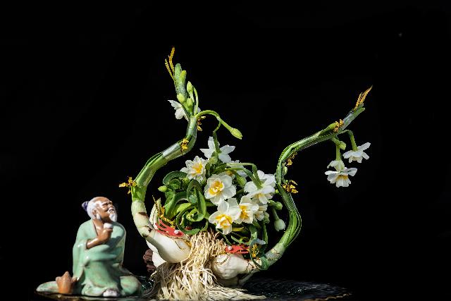 对普通市民来说,水仙花只要不养成“大蒜”,能够开花就已经算成功了。在倪明宪手中,普普通通的水仙球可以长成花篮,做成孔雀、葫芦、大象,甚至茶壶的造型,每一件都成为艺术品。若点缀些许小道具,就构成一道令人赏心悦目的风景,匹配着“凌波仙子”超凡脱俗的风姿和沁人心脾的花香,让赏花者领略“一花一世界,一叶一菩提”的万千意境。