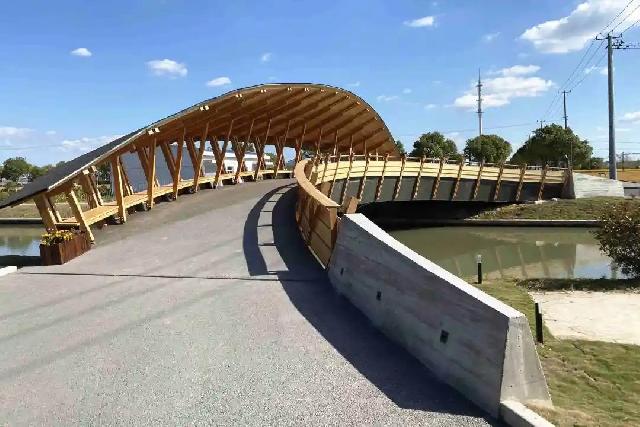 这座“景观桥”可谓“小巧玲珑”,它采用了天然的木结构、村落传统的小青瓦,以现代的设计手法象征着农村地区的朴实、恒久的生命力,营造出本土乡村特色的同时,还保留了当地百姓居民熟悉的回忆,得到“网红桥”的美誉。为了方便乘客通行,桥上安装了遮阳棚、木质联排座椅和无障碍通道等便民设施。