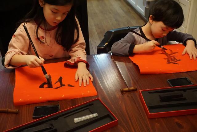 姐弟俩取出文房礼盒中的纸和笔,书写了几份充满中国传统年味的红斗方,并以此作品参加一亩童书馆所举办的“一亩汇四海,书香迎新年”活动,和全球的小伙伴们一起“写斗方、串春联”。