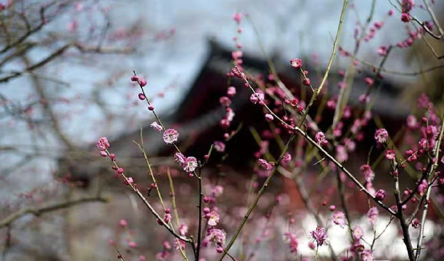公园里的早梅一朵朵点缀在枝头,在柔和的轻风里微微摇晃,让游客驻足举起来手中的相机。