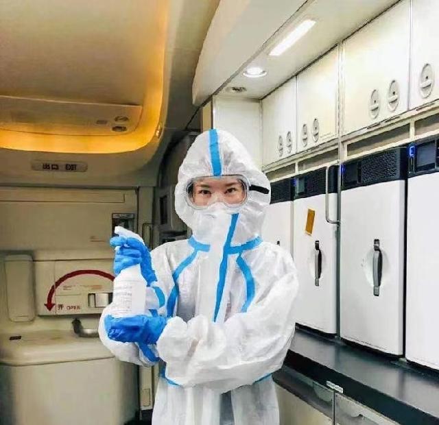 国际航班返程回国的时候,乘务员们都会换上全套防护服变身大白。王敏习惯在防护服背后写上:“欢迎回家”,来迎接归国的同胞。