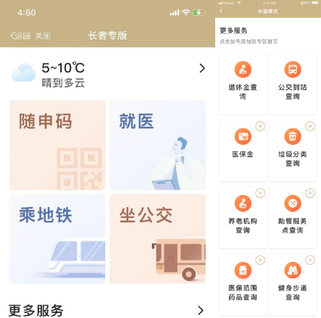 “便民服务”版块前期是默认天气预报、公交到站查询两个常用功能,新版本中有了更多的选择,点击“更多”,就有更多适合老年人使用的服务,同时支持用户自定义管理最常用的2个服务,最常用的服务可自行管理和灵活调整。