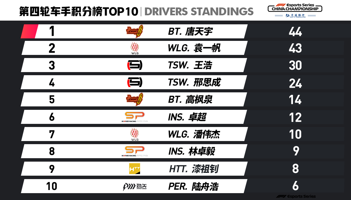 本轮过后,车手方面,BT.唐天宇、WLG.袁一帆、TSW邢思成占据TOP3,TSW王浩积90分紧随其后。车队方面,第一集团的TSW凭借两名TOP5车手高踞积分榜首,BT车队和WLG车队分列二、三名,第二集团INS、LHR、西安MRT车队积分差距不大,竞争激烈。