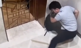 经过几番挣扎,男子放弃站起来,等待电梯门打开后,他蹲在门口,将背包一个一个地放到电梯里,而他手脚并用地爬进电梯。