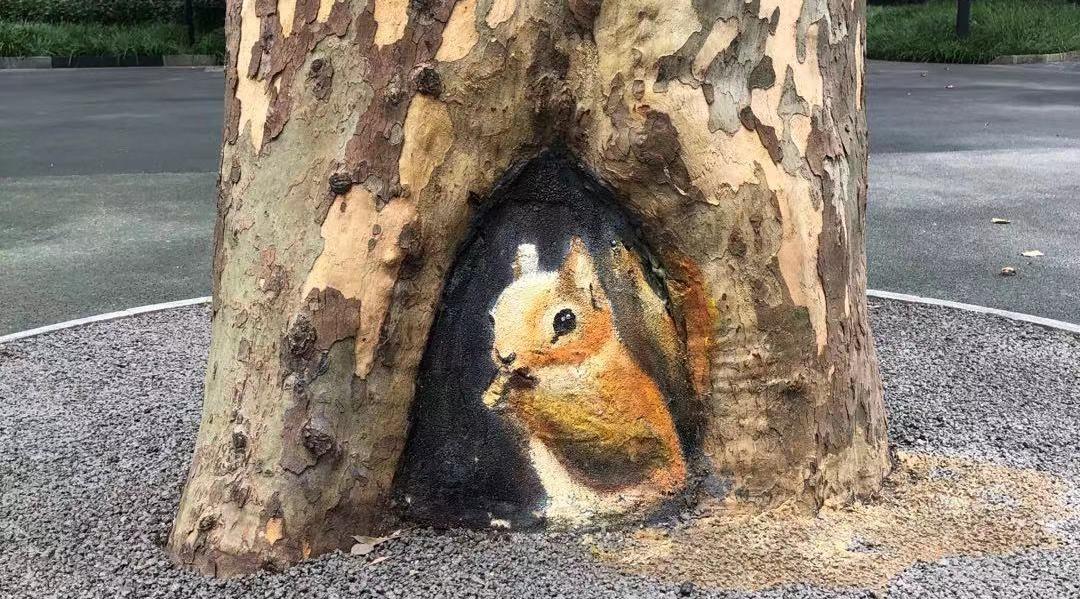 在树木上进行彩绘起源于几年前,国内也有其他城市对行道树或者公园里的树进行过树体彩绘。在申城,首个对公园的树木进行彩绘的并非闸北公园。此前,共青森林公园曾对园中多棵树木进行了树体彩绘,彩绘部位既有树洞,也有树干。而闸北公园的彩绘仅针对树洞,且彩绘的面积要超过共青森林公园。而对一个路段的行道树进行树洞彩绘的,永和路是第一条。