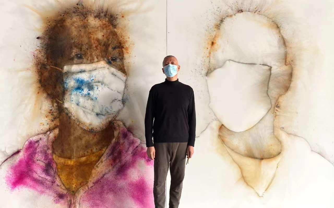 即将开售的蔡国强《自画像》由两块画布组成,画面上是两个戴着口罩的蔡国强头像。一幅风格写实,有着直面真实人生的审视感;另一幅是蔡国强戴口罩的头像轮廓,消解了五官和面部所有细节之后,让人有一种“茫然无措”的感觉。