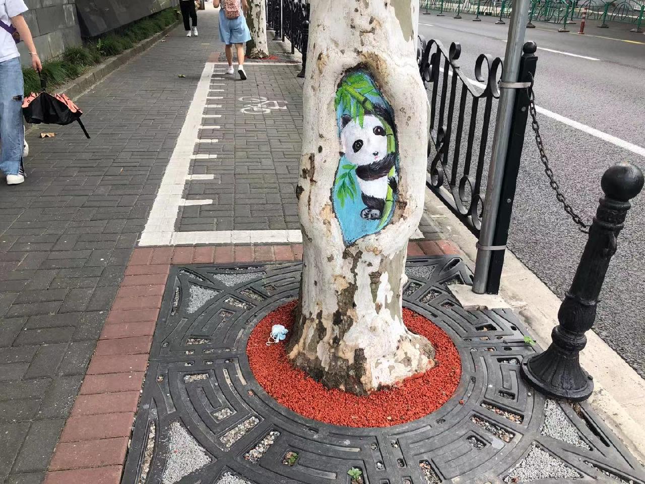 要说最近的永和路,有一点点网红的感觉。原先水泥填充的行道树蛀空树洞变身为一幅幅彩绘作品,“入住”了可爱的小动物(相关报道点此)。上周末,145棵悬铃木行道树还完成了树穴覆盖物改造,铺设了全新的红色覆盖物,仔细看,和周围其他道路的行道树树穴似乎有些不一样,踩上去软软的。