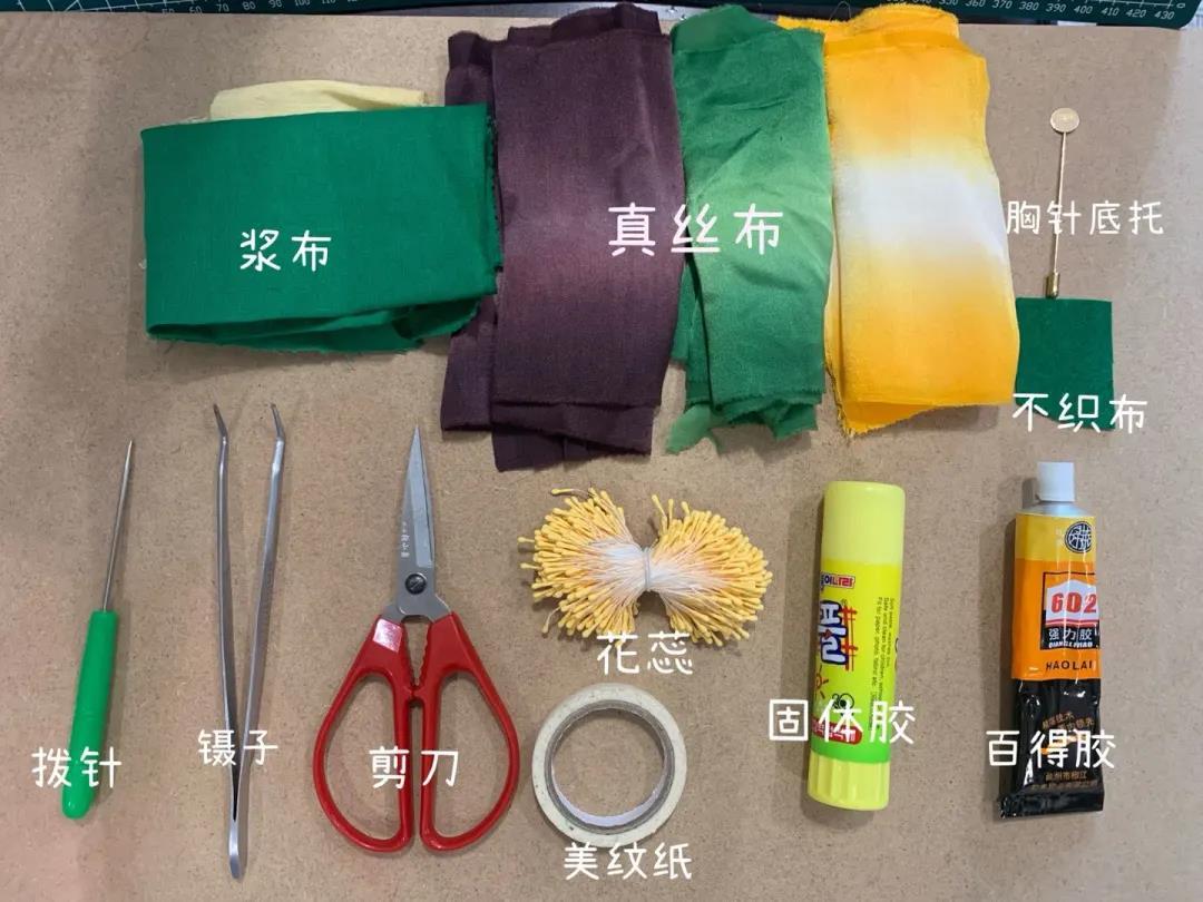 准备真丝布、剪刀等相关材料(如下图),在卡纸上描出五朵花,一一剪下,花瓣分别贴到布上放宽边剪下,包起来;花瓣反面贴上布,按花瓣形状剪下;四片花瓣围绕花蕊粘起来,造好型,五朵花皆是如此。