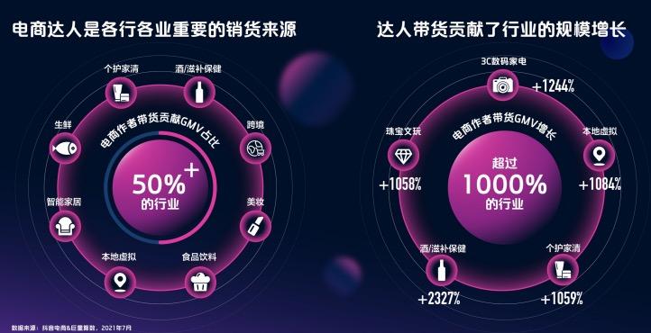 达人带货也贡献了很多行业的规模增长,根据《2021抖音电商达人生态报告》,截至2021年7月,在酒/滋补保健、珠宝文玩、各护家清、本地虚拟和3C数码家电的几个行业中,达人带货的GMV增长都在1000%以上。