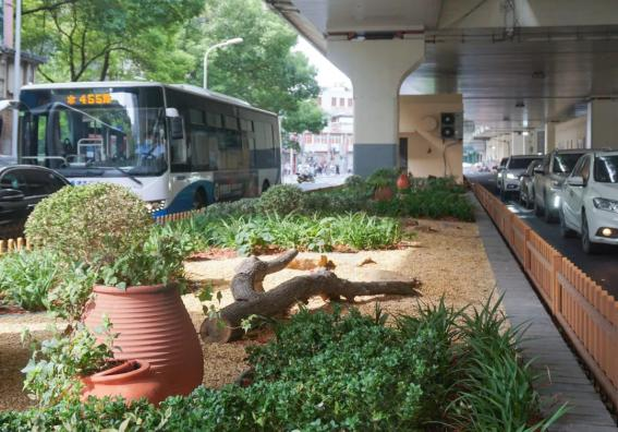 莫道高架桥下无绿洲。这里已经有圆润如玉的植物球以及巨大的“红枫”图案造型花带,花钵里吐露着芬芳,绿色地被让这片桥下之地更有质感和生态底气,木桩、山石等元素让南北高架下成为一个微型绿洲。