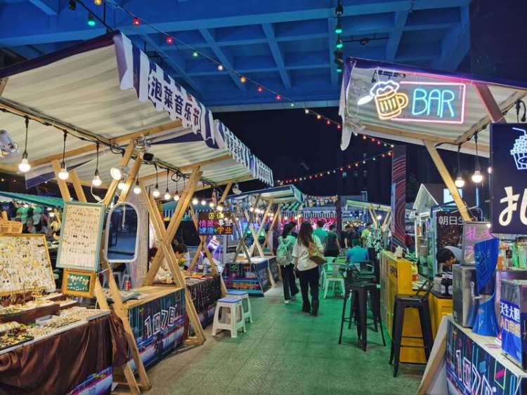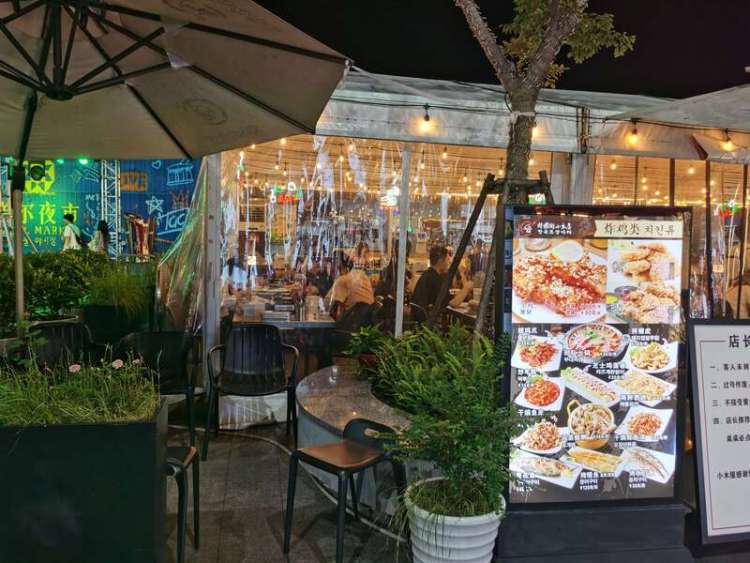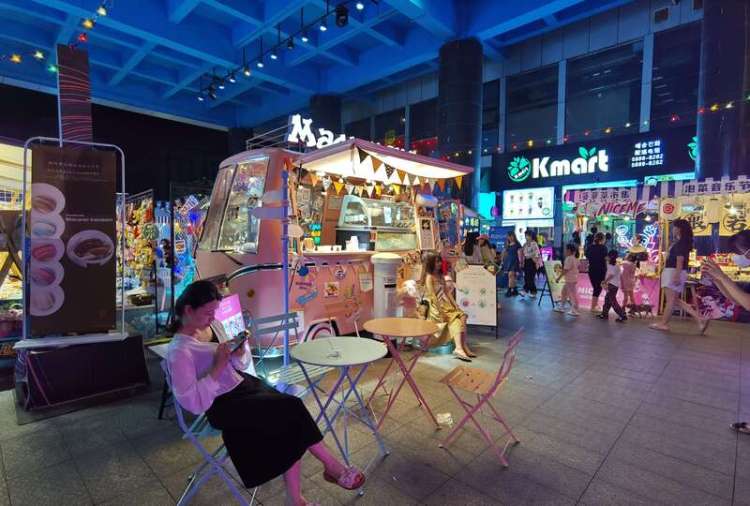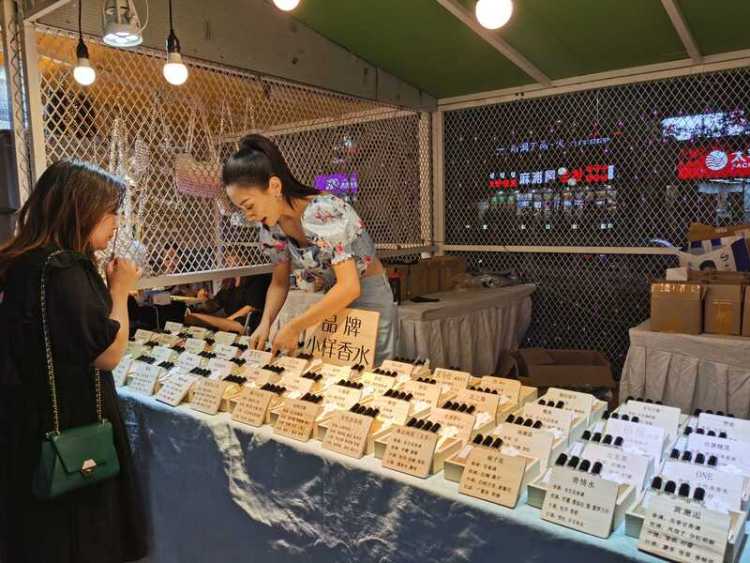它们的共同特点是,以商场为主办方,门口专辟区域,管理井井有条,座椅、花卉、艺术灯带,夜幕下的视觉效果、氛围营造极佳,就连摊贩们的帐篷也艳丽多彩,仿如一条风景线。