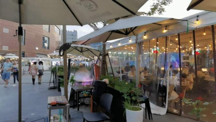 一家韩国烤肉店,在步行街区域搭建了一个颇有面积的临时帐篷,可容纳十几桌客人同时吃烤肉,内置空调,外用厚塑料遮挡,规模比正常店铺还大,门口排起长队。