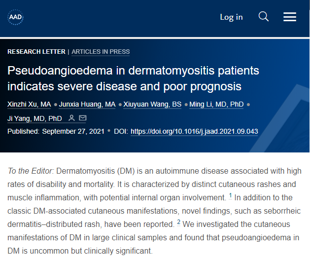 当皮肌炎患者出现血管性水肿样皮疹时需要引起当事人和医生的高度重视,应进一步排查肌炎特异性抗体。皮疹结合抗体可对患者进行精准分型、评估及制定差异化个体化治疗方案,并预测患者的预后转归。