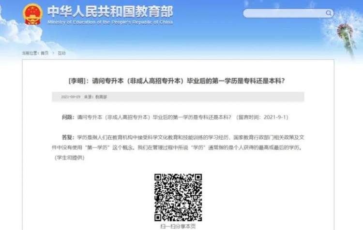 此前,教育部针对网友提问“请问专升本(非成人高招专升本)毕业后的第一学历是专科还是本科?”进行答复称: