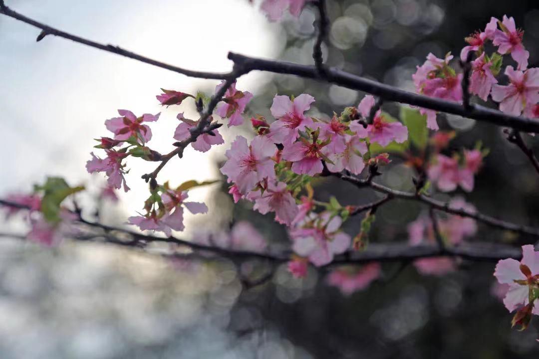 根据两个植物园的观察,目前反季节开花的植物主要有东京樱花、河津樱、美国樱、兰兰樱、红笠樱等樱花,以及海棠花。