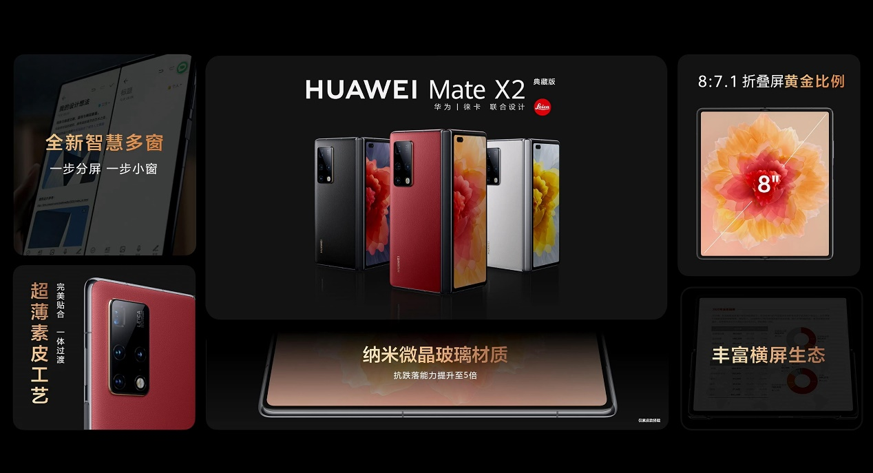 同时,华为发布了Mate X2典藏版,配备12GB内存、512GB存储,预装HarmonyOS 2。从产品设计上,华为的折叠屏手机采用了双楔形一体设计、双旋水滴铰链;业界首发磁控纳米光学膜、超强钢;8:7.1折叠屏黄金比例,搭配HarmonyOS 2智慧多窗,支持一步分屏、一步小窗以及游戏、视频等应用的横屏小窗等。