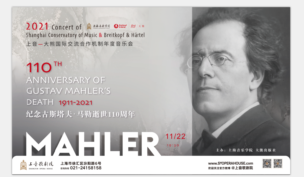 在此背景下,两年前结缘的上海音乐学院与德国大熊音乐出版社不谋而合,共同决定将本年度交流活动的主题定为“致敬马勒”,并将于11月22日晚,在上音歌剧院合作举办“马勒逝世110周年纪念音乐会”。
