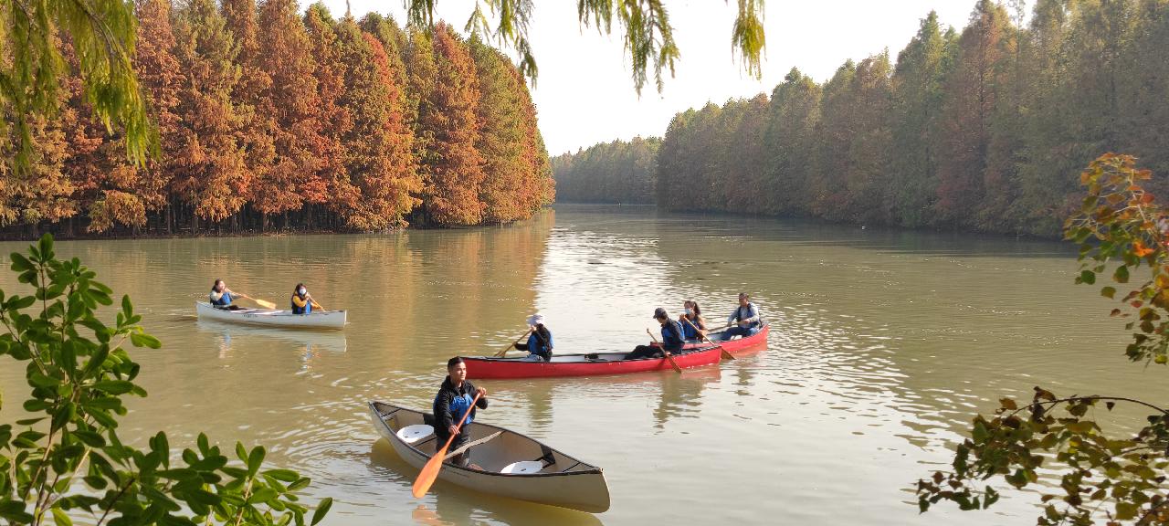 游客可以搭乘观光红船,也可以划一艘皮划艇,穿梭于水巷中,观赏到火红的树影倒映在湖面中;天空、红杉林与平静的湖面一起相互映衬,美不胜收。坐在船上,看远处的杉林,仙雾缭绕,晶莹剔透,别有一番风味。