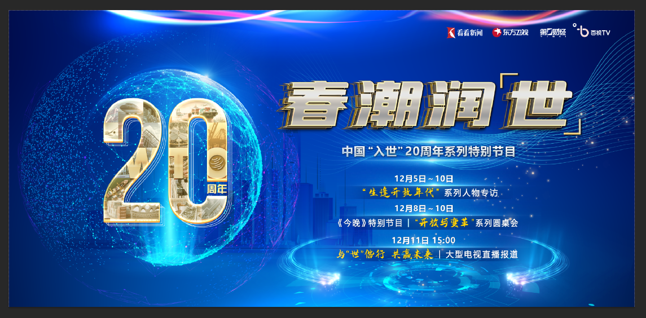 12月11日是中国正式加入世贸组织20周年纪念日。当天,东方卫视将联合第一财经、看看新闻网共同推出《与“世”偕行 共赢未来——中国入世20周年直播特别报道》。约三个小时的直播将从纽约长滩码头、伦敦证券交易所、日内瓦世贸组织总部、香港证交所等全球多个直播点发来报道,带领观众坐上穿梭于伦敦街头的比亚迪大巴,走进中企开设在美国的玻璃工厂,前往中老边境的小城感受中老铁路开通给区域经济联通带来的变化,直击“双12”前夕电商物流的繁忙。通过全球多点连线报道结合演播室嘉宾访谈方式,展现入世20年来,中国如何助力全球发展,做出“中国贡献”,提供公共产品,体现“中国担当”,坚持扩大开放塑造“中国样本”, 共迎多重挑战,提供“中国方案”。