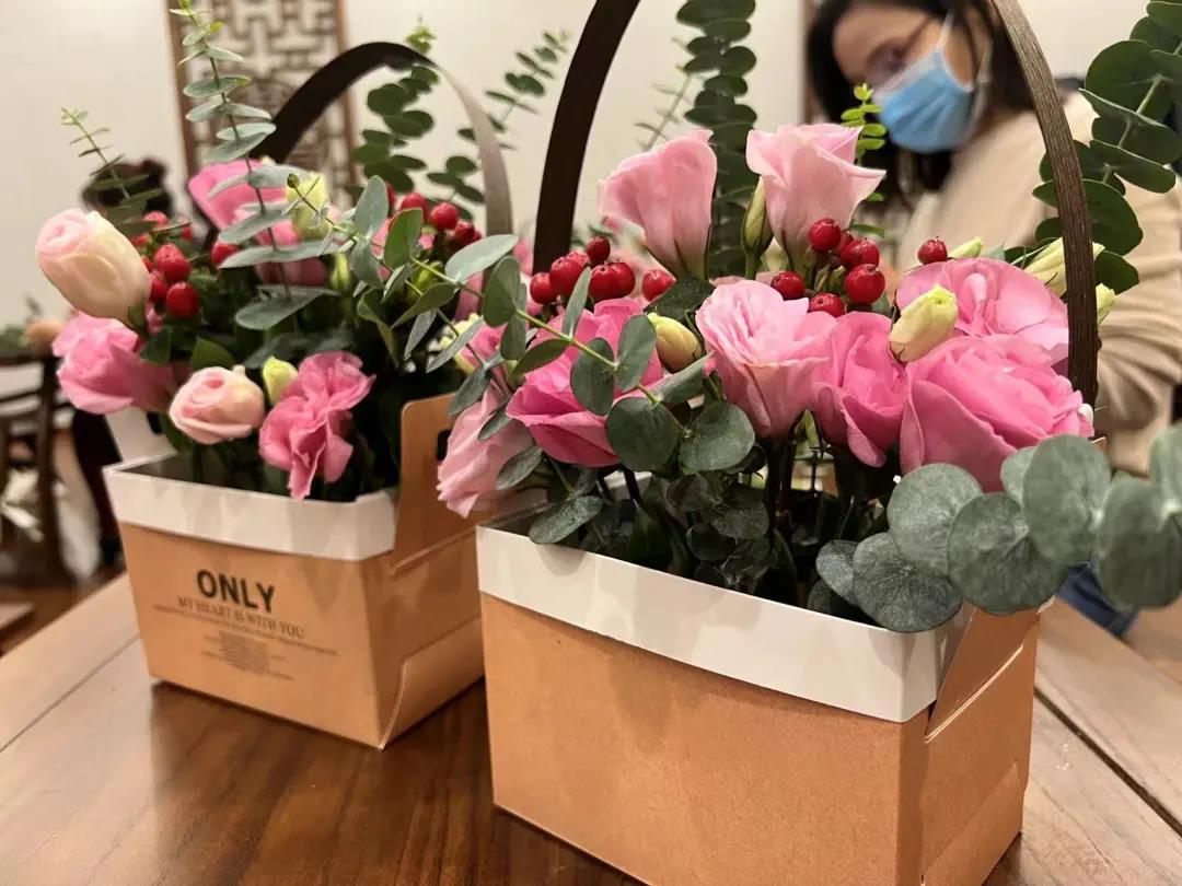 大家专心地投入到作品制作当中,对枝叶仔细地修剪,对花朵顺序进行有序排列和固定,娇艳的洋桔梗、热烈的红豆、挺拔的尤加利叶,一支支花材在居民们的巧手中被摆放得错落有致。随着一件件独具韵味的作品出炉,这场生动的插花活动也在大家的欢声笑语中进入了尾声。