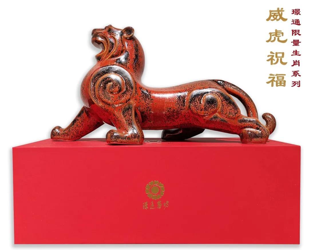 今逢盛世,虎跃龙腾,通过昂首阔步的艺术造型与神韵,表达中国走向世界的自信和力量,也象征了繁荣昌盛的时代特点。作品用变化丰富的红色釉料增添了喜气吉祥的祝福气氛,红色包装礼盒和金色贺卡,更是增加了对新年的祝福和美好生活的祝愿。
