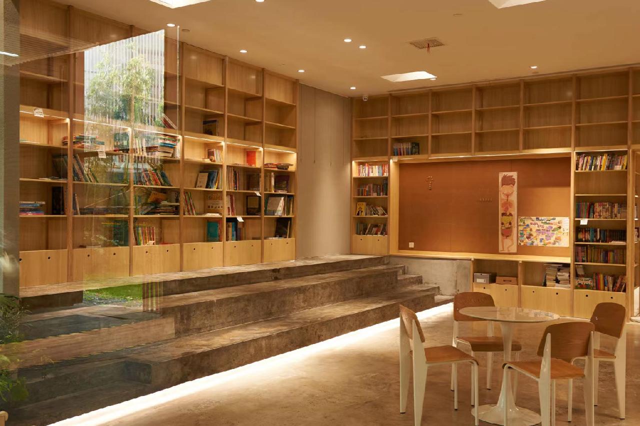 馆内以清晰简洁为主,原木书架从入口延伸到书店深处,清晰透彻的玻璃窗将室外景色引入室内,书籍堆砌的背景墙也为空间增添了书香气息。