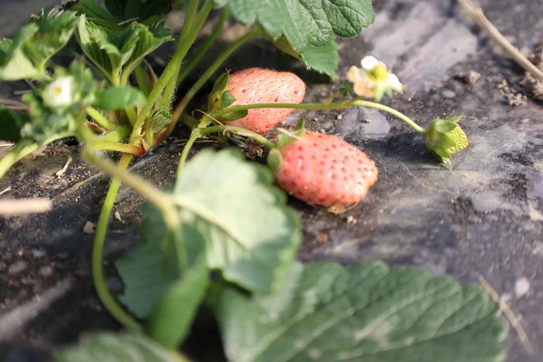 走进草莓种植大棚,一股清甜的香气迎面而来、沁人心脾。放眼望去,只见翠绿植株之上,一个个粉白色的草莓在绿叶和白花间不时探出了头,粉嫩的颜色惹人喜爱。