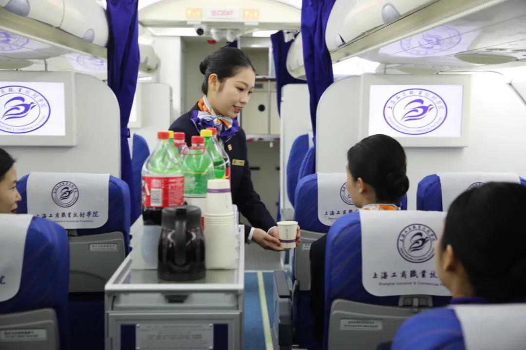 “女士您好,有什么需要为您服务的吗?”“我要一杯水,谢谢!”在空乘专业所在的PICH现代服务学院,学生们正在一架空客A320模拟机舱内练习为乘客提供饮料服务。