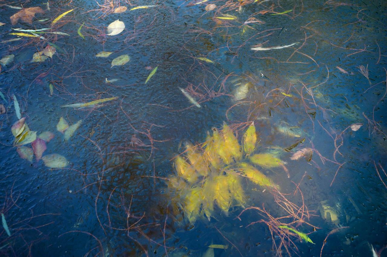 水面上的黄叶和红叶被冻住定格在冰层中,落叶重重叠叠被挤压在一起,竟然缔造出一种想象不到的图案。