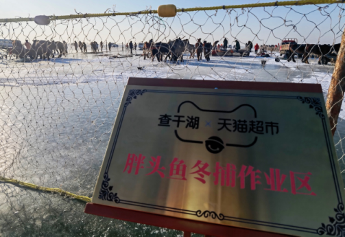 12月28日,在“天猫超市×查干湖”胖头鱼冬捕作业区,一网网因《舌尖上的中国》而走红的胖头鱼,从半米厚的冰层下被打捞出水,自然速冻后,立即被送往湖边的猫超专属渔场进行检测、分拣、打包,实现从冬捕冰面到消费者餐桌的“产地直发”。