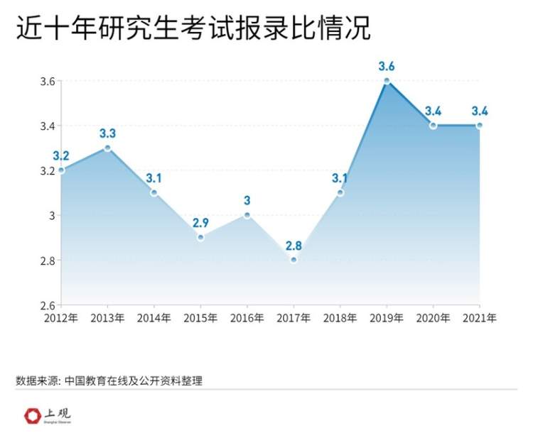 报录比是指报考人数与录取人数的比值,一般来说,报录比越高,也就意味着竞争越激烈。2012年至2021年的考研总体报录比基本在3:1上下浮动。2017年的报录比最低(2.8:1),2019年的报录比最高(3.6:1)。