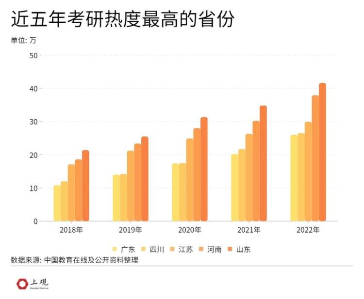 近五年间,山东、河南、江苏、四川以及广东成为考研热度最高的省份,报考人数也是逐年递增。