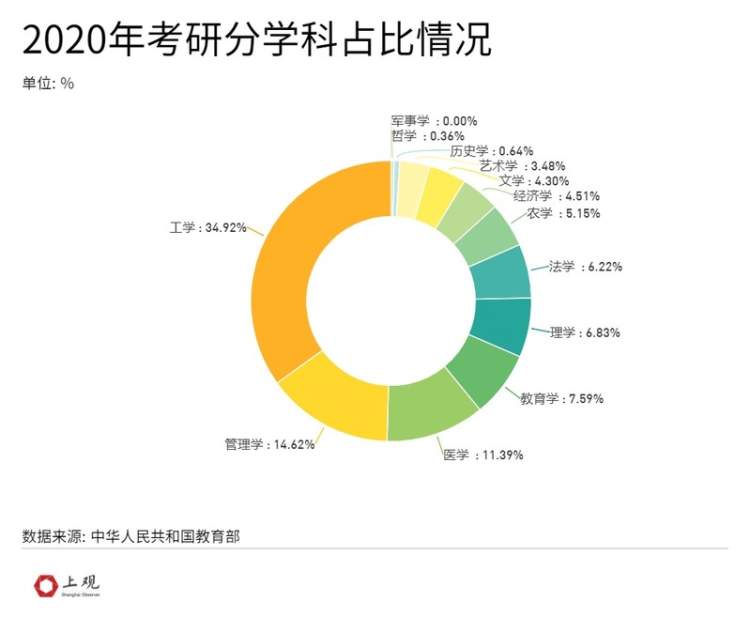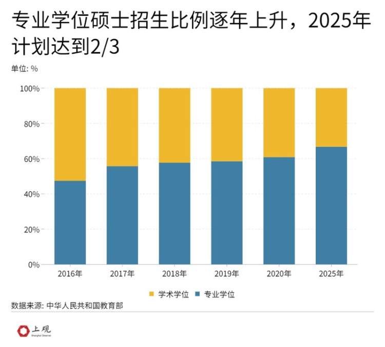 2020年9月教育部发布《专业学位研究生教育发展方案(2020-2025)》,指出到2025年将硕士专业学位研究生招生规模扩大到硕士研究生招生总规模的三分之二左右。这意味着,硕士培养以从事学术研究为目标的占少数,从事专业性工作的将占多数,一定程度上优化人才培养结构,产教融合。