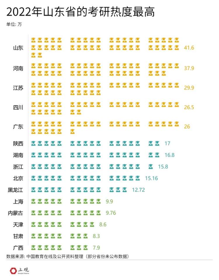 从部分省份所公布的考研人数来看,山东省拔得头筹,报考人数突破了40万。山东省内的曲阜师范大学、烟台大学、聊城大学、青岛农业大学更是被称为全国“四大考研基地”。