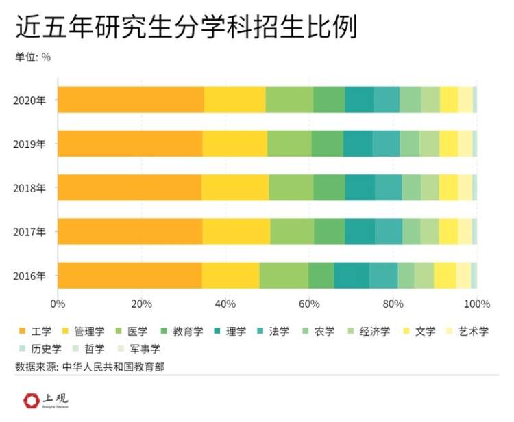 从近五年的研究生招生比例看,招生人数前三位的专业是工学、管理学和医学。