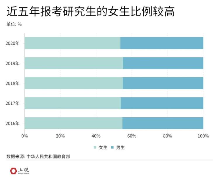 近五年中,考研女生比例均超过了男生,最多达到55%。2020年男女生报考人数相差超过7万人。