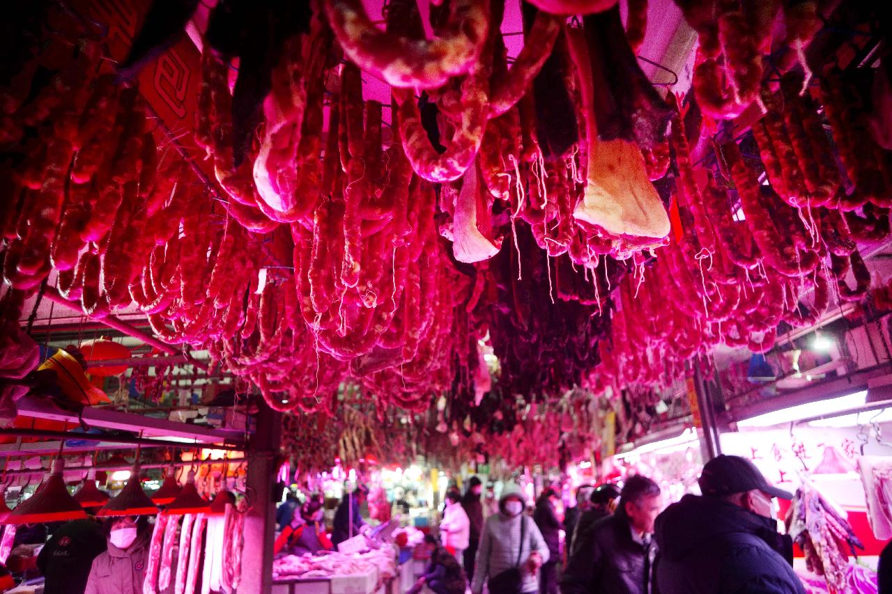 走进地处老城厢的这家菜场,浓浓年味就扑面而来。成串红白相间的腊肠、劈背成片的鳗鲞、大块的酱油肉、整只的咸鸡咸鸭……统统被挂在绳子上,与大红灯笼完美融合,构成了一幅老城厢菜场独特的年俗画。