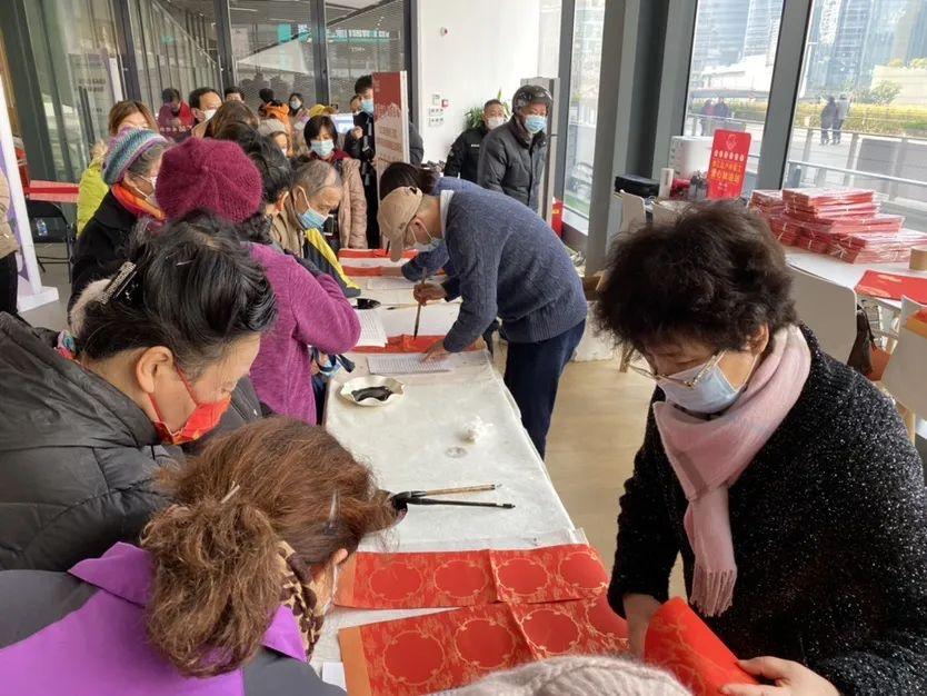 走进位于T20二楼的新冠疫苗接种点,就能感受到浓浓的新春氛围,徐家汇街道特别邀请到上海市书法家协会副主席田文惠,上海青年书法家协会主席卢新元,上海青年书法家协会秘书长戴玉辉,奉贤区书协副主席秘书长吴雯婷为来接种疫苗的市民现场书写福字和春联。