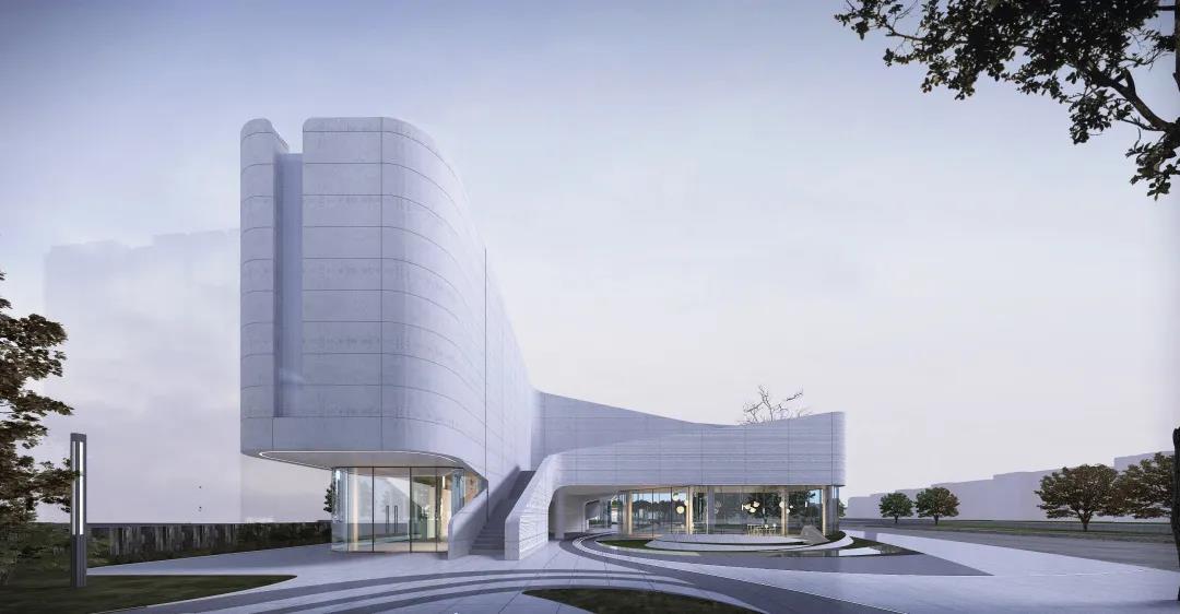 建筑的造型简洁,运用环保材料,通过石材、玻璃等不同材质对比体现建筑形体的虚实关系,色彩以灰、白、线为主,体现出生态、科技、活泼的特点,结合周边空间,将其打造成为具有宝山区特色的城市公园与市民活动中心相结合的特色城市空间。