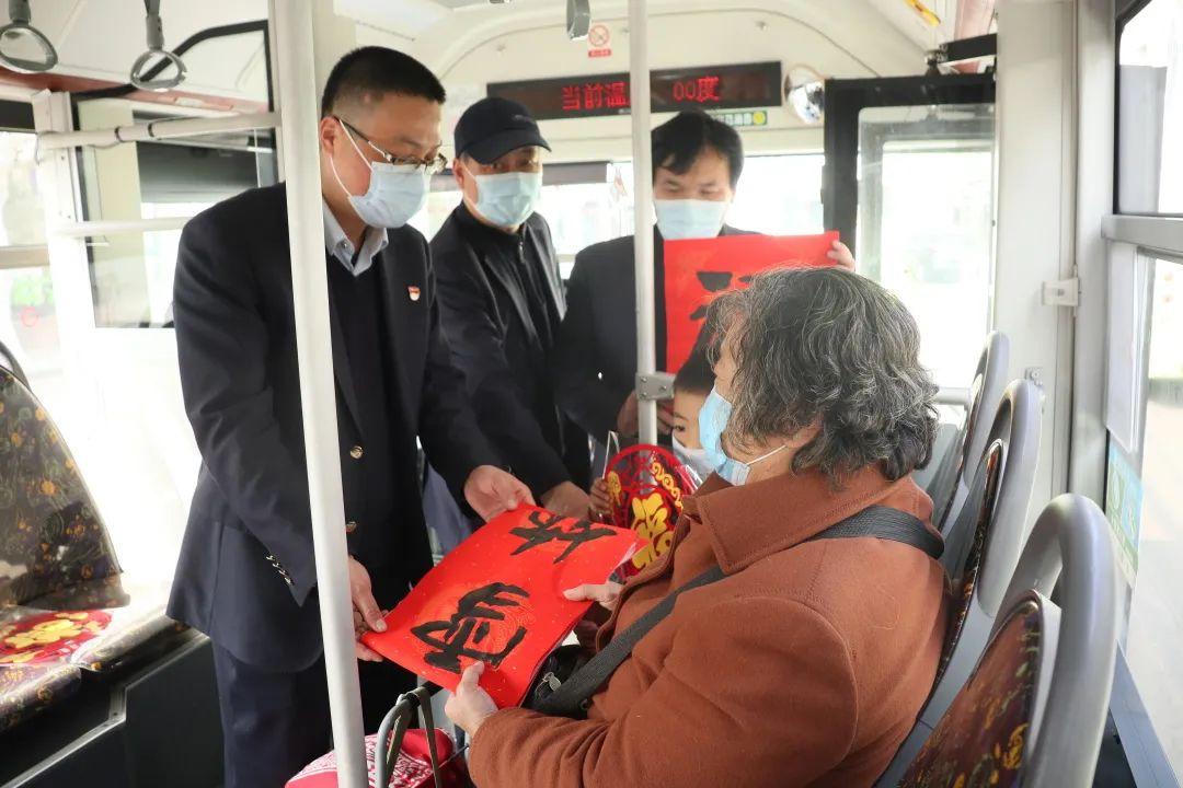 平阳车队职工、市美术家协会会员孔雄,执笔书写了多幅寓意文明祥和、催人奋进的虎年春联,由公交志愿者送入732路车厢,发放给乘客,送上新年祝福。