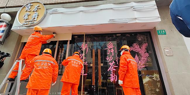 “这块也拆下来。”1月27日,在几名静安区应急中心工作人员的熟练操作下,装在愚园路228号霓裳茶舞奶茶店及隔壁桂林米粉店的木板被迅速拆除,露出了两家店的玻璃门。